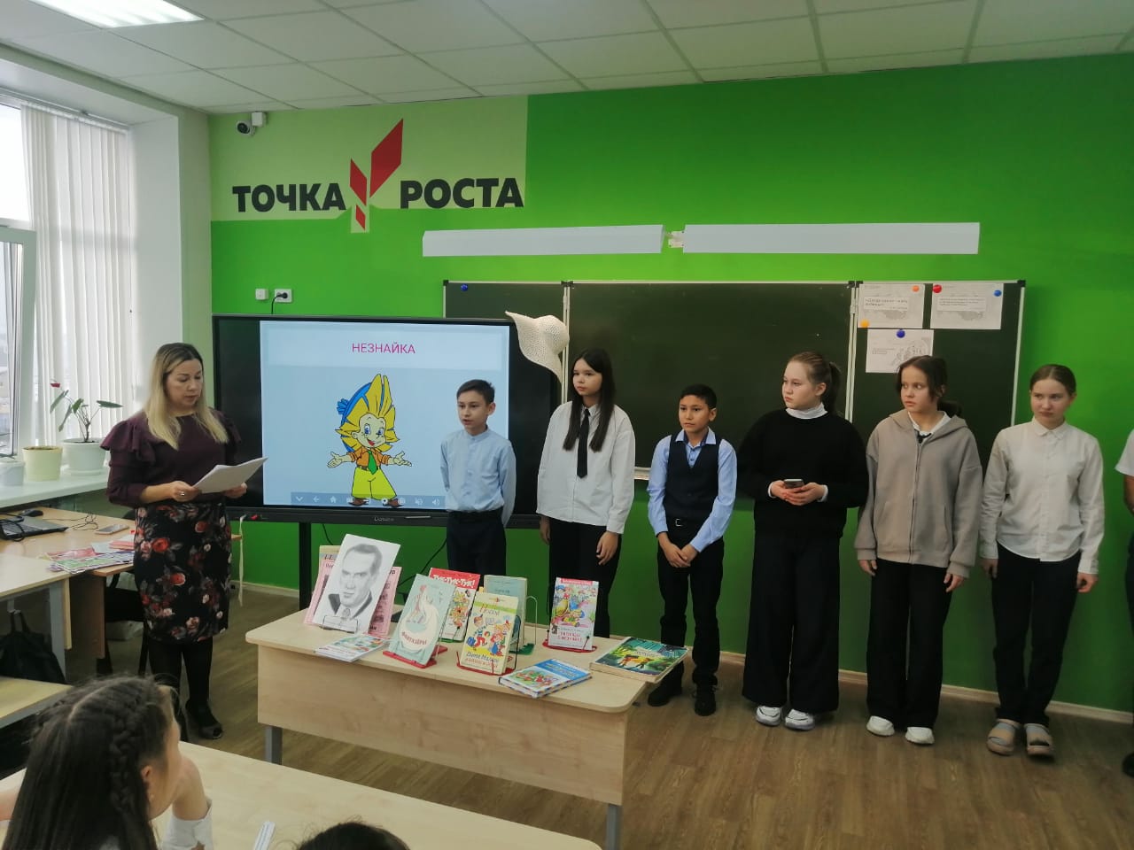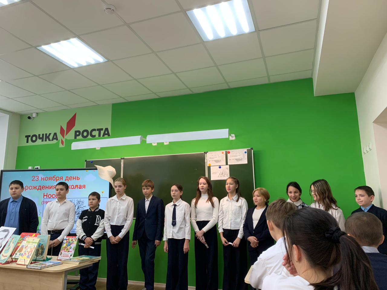 1957нче елда рус язучыларының китаплары тиражы буенча Носов китаплары өченче урын алды. Шушы һәм башка кызыклы фактлар турында 5Б, 6Б сыйныфы укучылары Носовның Н.Н. тууына 125 ел тулу уңаеннан үткәрелгән чарада белделәр. 5Б сыйныфы укучылары (Крюкова Л.Ю.) язучының биографиясеннән кызыклы мәгълүмат сөйләделәр. Аннары 6Б сыйныфы укучылары (Горшкова Р.А. җитәкчелегендә) «Белмәмеш Кояшлы шәһәрдә» китабының барлыкка килү тарихын җиткерделәр.