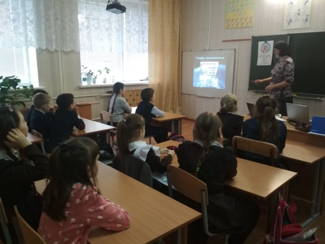 1961 елның 12 апрелендә «Восток» космик ракетасы Байконур космодромыннан старт алды. Шул уңайдан география укытучылары Сәлахиев Н.Ю., физика укытучылары Сәлахиева Р. Н.мәктәп күләмендә сыйныф сәгате үткәрделәр. Мәктәпнең туган якны өйрәнү музеенда булган мәгълүмат белән таныштырдылар. Презентациядә космонавтикага зур өлеш керткән чыгарылыш сыйныф укучыларынын хезмэтлэрен күрсәттеләр