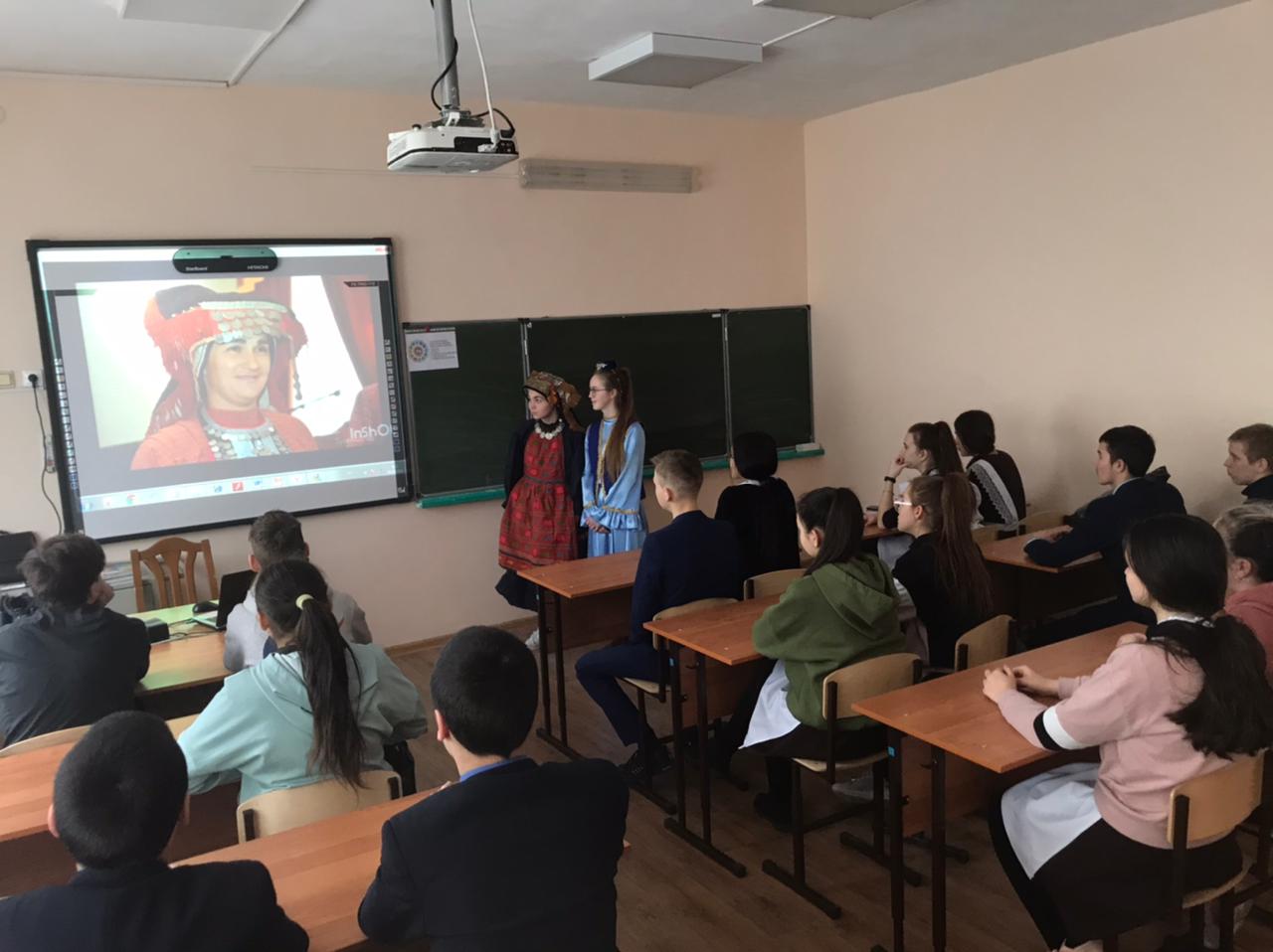 В 9-х классах в связи с годом родных языков и народного единства в Татарстане показана презентация на тему “Этнографические и сценические женские костюмы татар и кряшен”. Учащиеся ознакомились с особенностями и национальным колоритом традиционных костюмов народов, проживающих на территории Рыбно-Слободского муниципального района.