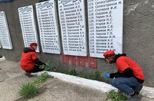 Члены отряда Юнармия принимают участие в благоустройстве территории обелиска погибшим односельчанам.