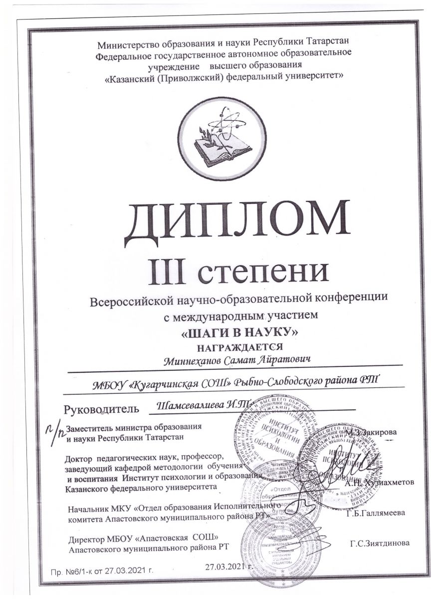 Призер Всероссийской научно-образовательной конференции с международным участием «Шаги в науку» - Миннеханов Самат.