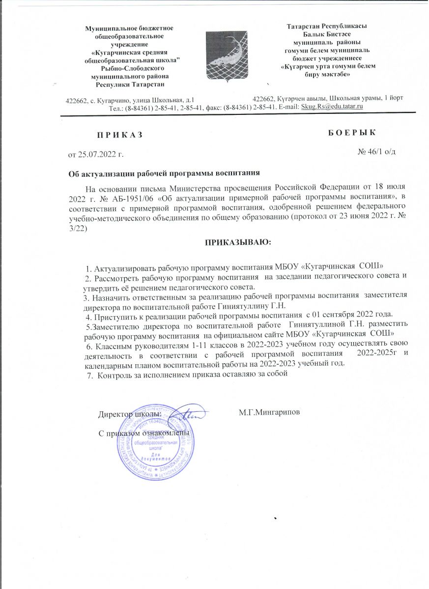 | Адрес: | 422662, Республика Татарстан, Рыбно-Слободский район, с. Кугарчино, ул. Школьная, д.1 /Татарстан Республикасы, Балык бистәсе муниципаль районы, Күгәрчен авылы, Мәктәп урамы,1 нче йорт |