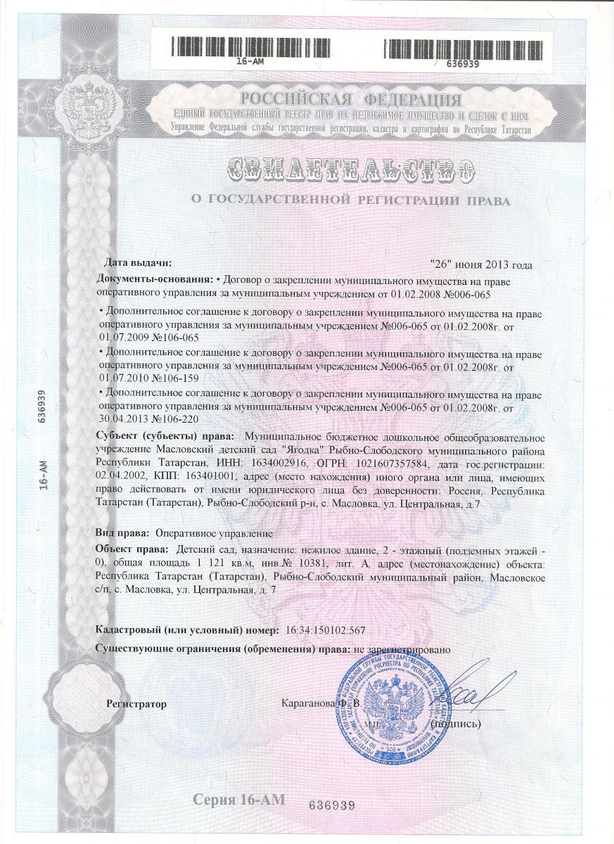 Свидетельство о государственной регистрации права на земельный участок детского сада "Ягодка"