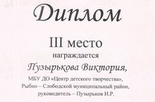 Диплом за III место в номинации "Парки и скверы малой Родины" (младшая возрастная группа 7-10 лет) заняла Пузырькова Виктория.