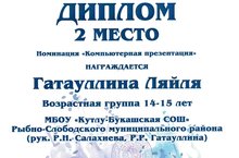 В конкурсе творческих работ "Дорога в космос" Диплом за II место получила Гатауллина Ляйля (МБОУ "Кутлу-Букашская СОШ", руководители Салахиева Р.Н., Гатауллина Р.Р.) (возрастная группа 14-15 лет).