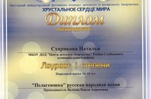 На прошедшем 18-19 апреля в г.Казани ежегодном международном фестивале-конкурсе детского и юношеского творчества "Хрустальное сердце мира" Старикова Наталья награждена Дипломом I степени (руководитель Валеева Н.А.). Наталья выступила в старшей группе (15-18 лет) с композицией на тему русской народной песни "Пелагеюшка".