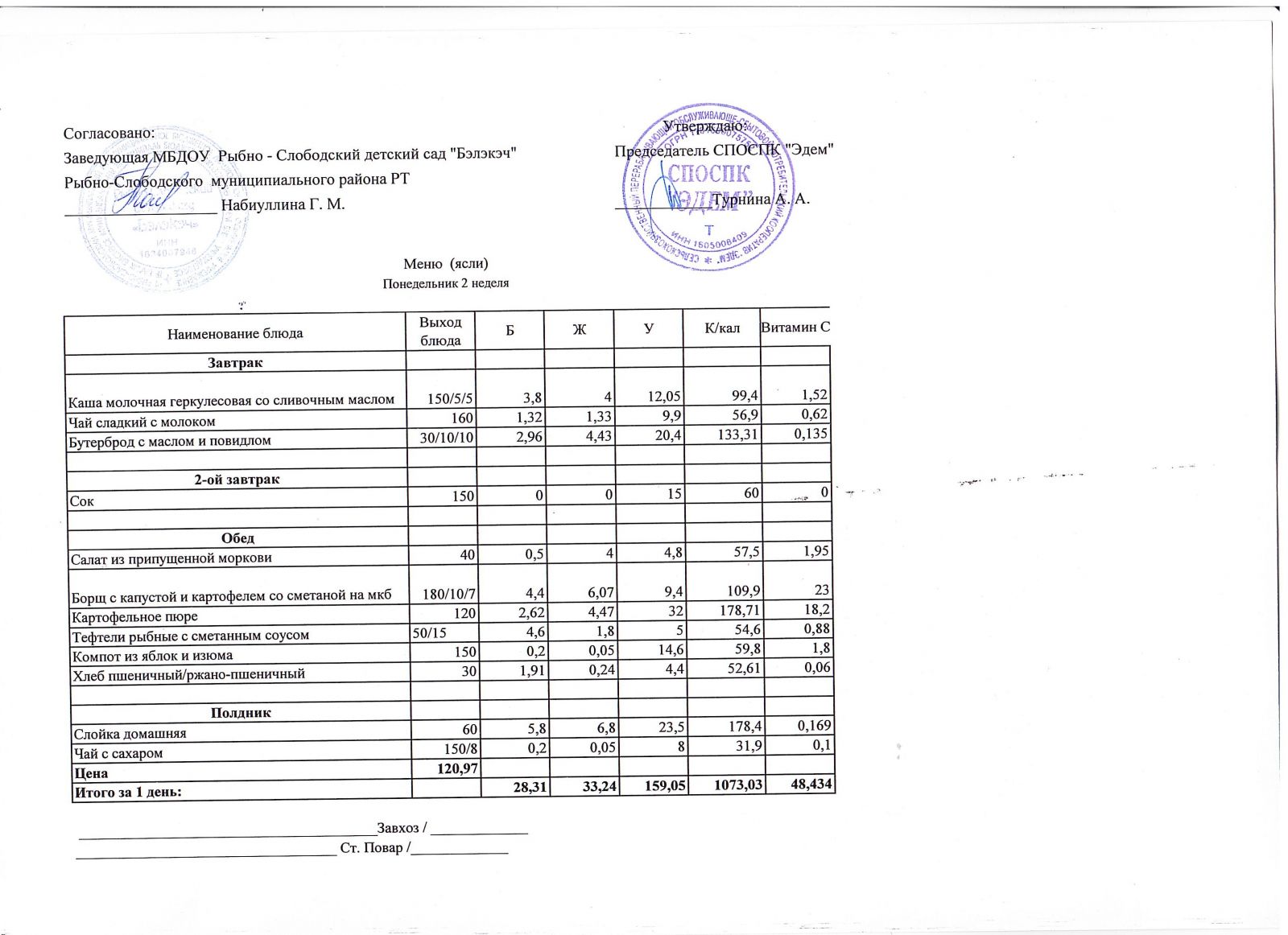 Меню(ясли) понедельник вторая неделя 11.03.2024