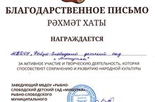 Коллектив детского сада "Мишутка" награжден благодарственным письмом за организацию и активное участие, творческую деятельность,которая способствует сохранению и развитию народной культуры. Желаем дальнейших успехов!