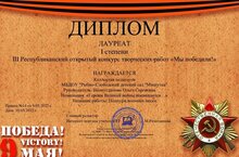 В III Республиканском открытом конкурсе творческих работ "Мы победили!" коллектив педагогов (Назмутдинова О.С., Кирюшова С.Ю., Захарова И.А., Круглова С.П. , Гордеева О.В.) завоевали диплом лауреата 1 степени в номинации "Героям Великой войны посвящается..."