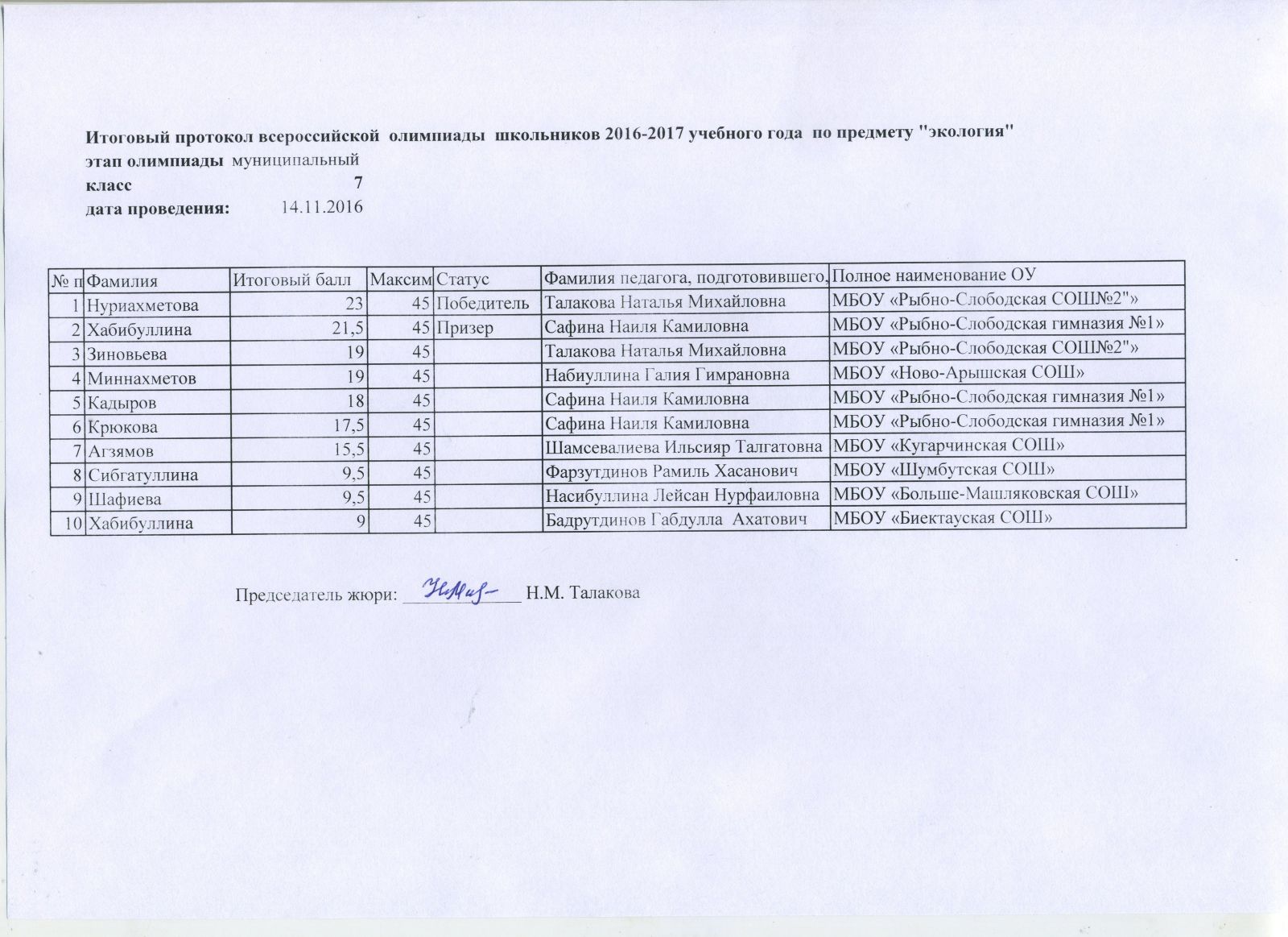 Итоговый протокол МЭ ВОШ по экологии 7 класс