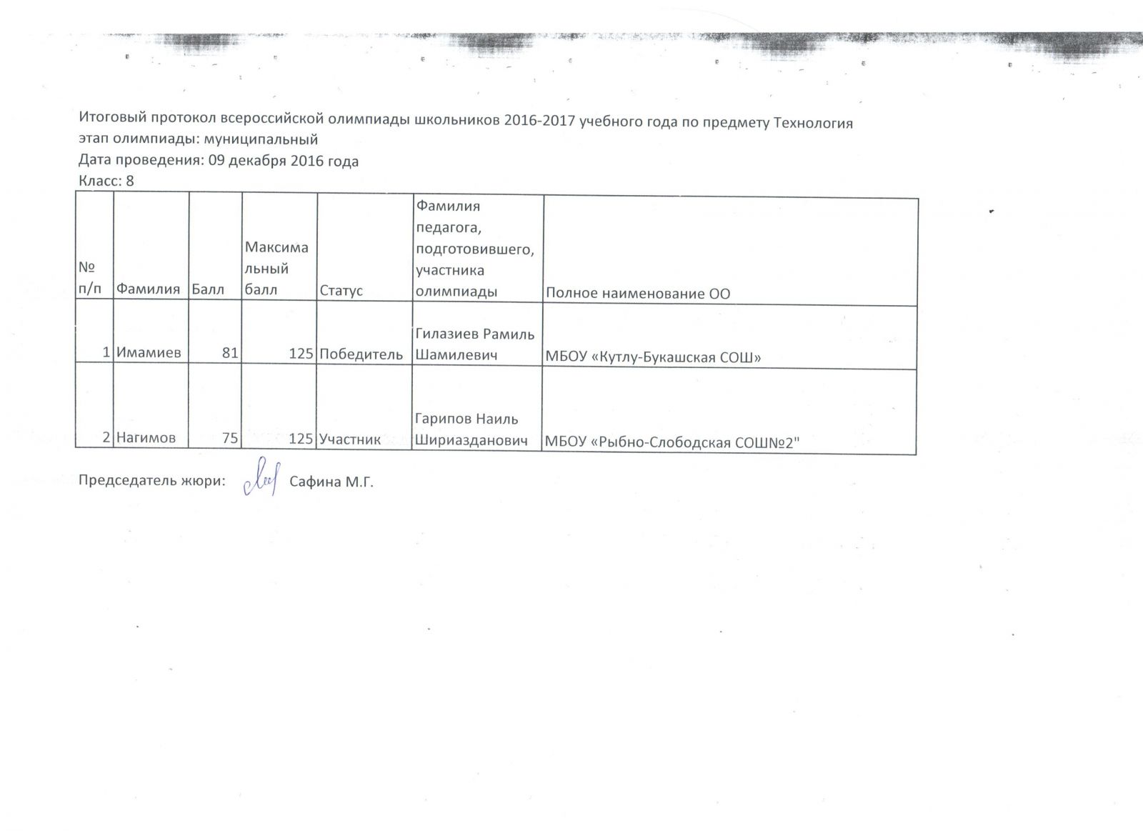 Итоговый протокол ВОШ по предмету технология 8 класс