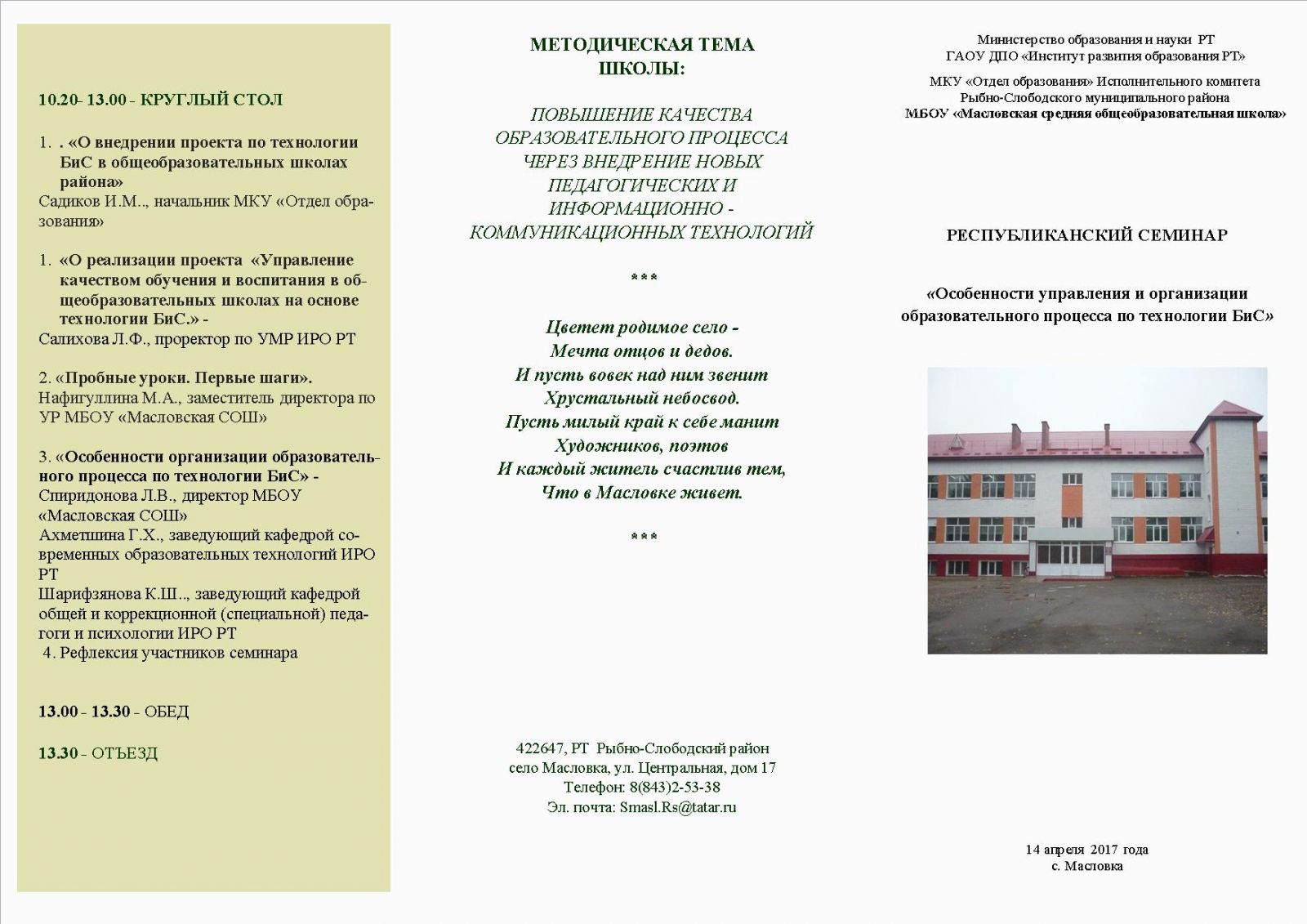 Опубликовано: 14.04.201714 февраля 2017 г. на базе МБОУ "Масловская СОШ" пройдет ЕСПУБЛИКАНСКИЙ СЕМИНАР «Особенности управления и организации образовательного процесса по технологии БиС»