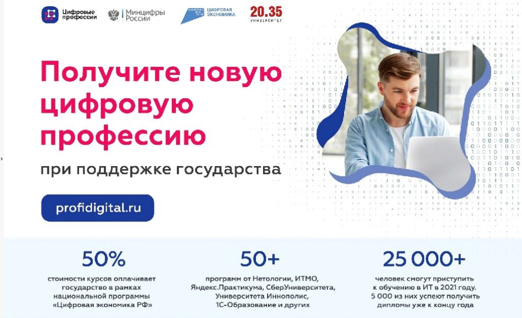 Минцифры России и Университет 2035 объявляют набор на обучение по проекту «Цифровые профессии». Дополнительное ИТ-образование со скидкой 50%, 75% или бесплатно стало доступно жителям всех регионов России старше 16 лет.