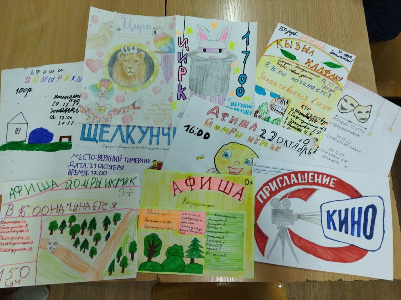 Опубликовано: 26.10.2023На занятиях театрального кружка Верхне-Тимерлековской школы научились делать афиши сами. Их афиши очень интересные, они притягивают зрителя.