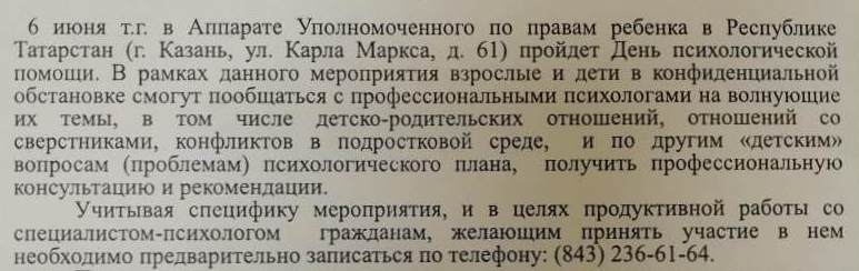 6 июня т.г. в Аппарате Уполномоченною по правам ребенка в Республике Татарстан (г. Казань, ул. Карла Маркса, д. 61) пройдет День психологической помощи. В рамках данного мероприятия взрослые и дети в конфиденциальной обстановке смогут пообщаться с профессиональными психологами на волнующие их темы, в том числе детско-родительских отношений, отношений со сверстниками, конфликтов в подростковой среде, и по другим «детским» вопросам (проблемам) психологического плана, получить профессиональную консультацию и рекомендации.