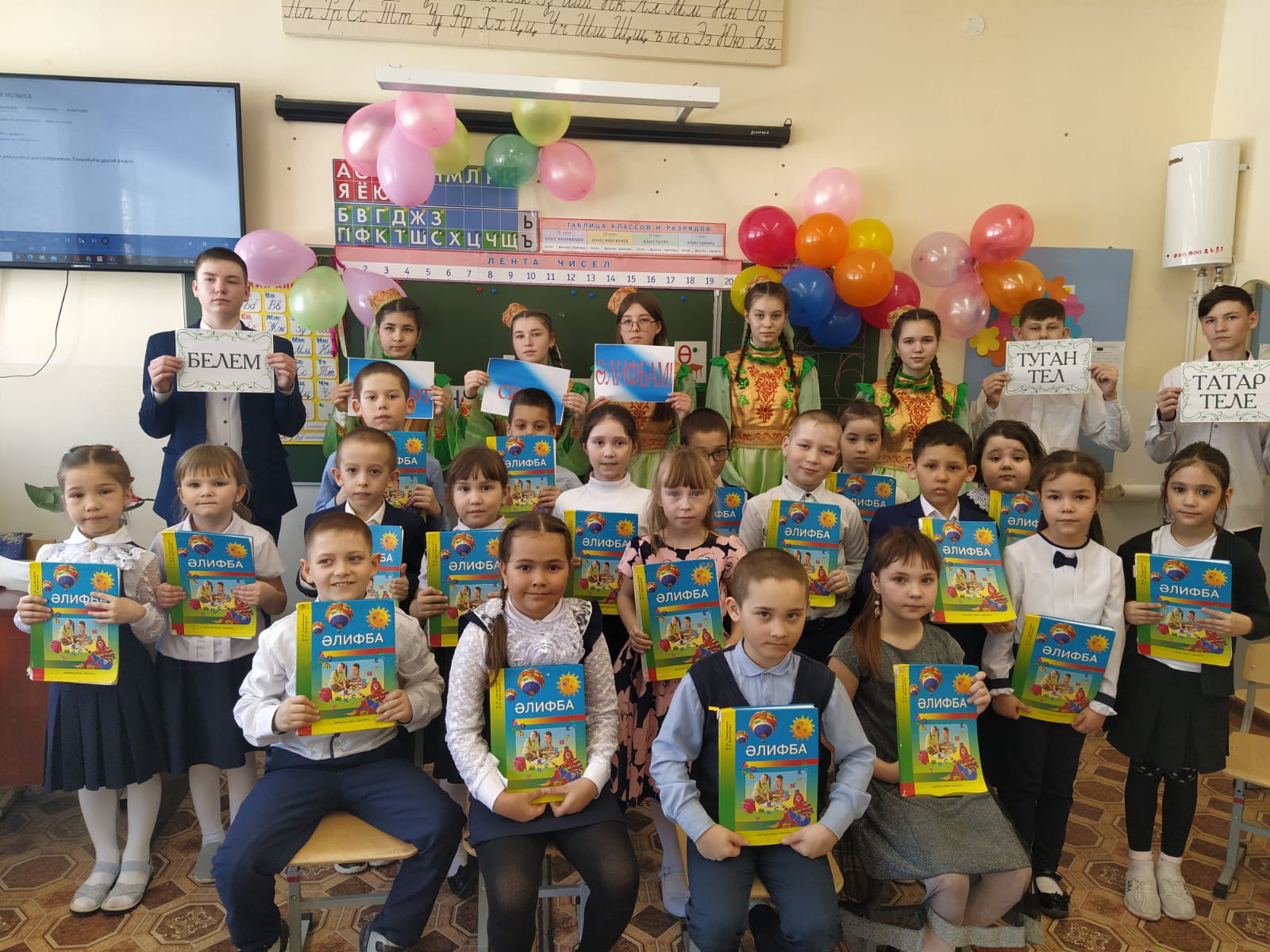 “Хуш, Әлифба! “- беренче сыйныф укучылары тормышында зур вакыйга. 1 нче сыйныф укучылары белем дөньясындагы беренче җиңүләрен бәйрәм иттеләр. Бәйрәм җыр, бию, шигырьләр, уеннар белән бергә үрелеп барылды. Балалар “ Белем иле”, “Әлифба” тукталышларында булып, төрле биремнәрне башкардылар, .