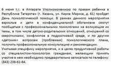 6 июня т.г. в Аппарате Уполномоченною по правам ребенка в Республике Татарстан (г. Казань, ул. Карла Маркса, д. 61) пройдет День психологической помощи. В рамках данного мероприятия взрослые и дети в конфиденциальной обстановке смогут пообщаться с профессиональными психологами на волнующие их темы, в том числе детско-родительских отношений, отношений со сверстниками, конфликтов в подростковой среде, и по другим «детским» вопросам (проблемам) психологического плана, получить профессиональную консультацию и рекомендации.