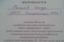 Учитель физкультуры Фасхиев И.М. занял 2ое место в районных соревнованиях "Кросс Татарстана-2018" среди организации Рыбно-Слободского муниципального района в возрастной категории 41-50 лет среди мужчин.