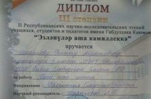 Диплом 3 степени получил ученик 4 класса МБОУ "Шеморбашская ООШ" Шарипов Р.А. в республиканском научно-исследовательском чтений учащихся, студентов и педагогов имени Габдулхака Каюмова "Эзләнүләр аша камиллеккә". Руководитель- учительница татарского языка и литературы Шарипова Л.Г.