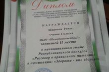 Ученик 4 класса Шарипов Р. занял 2 место и награжден дипломом в муниципальном этапе республиканского конкурса "Разговор о правильном питании" в номинации "Здоровье-это здорово" .