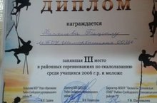 Дипломом за 3 место была награждена ученица 5 класса Фасхиева Т.И. в районных соревнованиях по скалолазанию среди учащихся 2006 года и моложе.