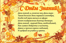 Вот и пришел один из самых главных праздников в году, — день знаний! Этот день приводит с собой золотую осень, а вместе с ней и пору новых открытий, интересных приключений, ярких событий! Поздравляем всех учителей и учащихся с этим потрясающим праздником! Пусть не покидает вас вдохновение, жизненная мудрость, жажда новых открытий, желание учиться и дарить знания окружающим! Получайте знания с легкостью и удовольствием, дерзайте! Все начинания ваши пусть увенчаются успехом, блистайте во всех науках и предметах! С праздником!