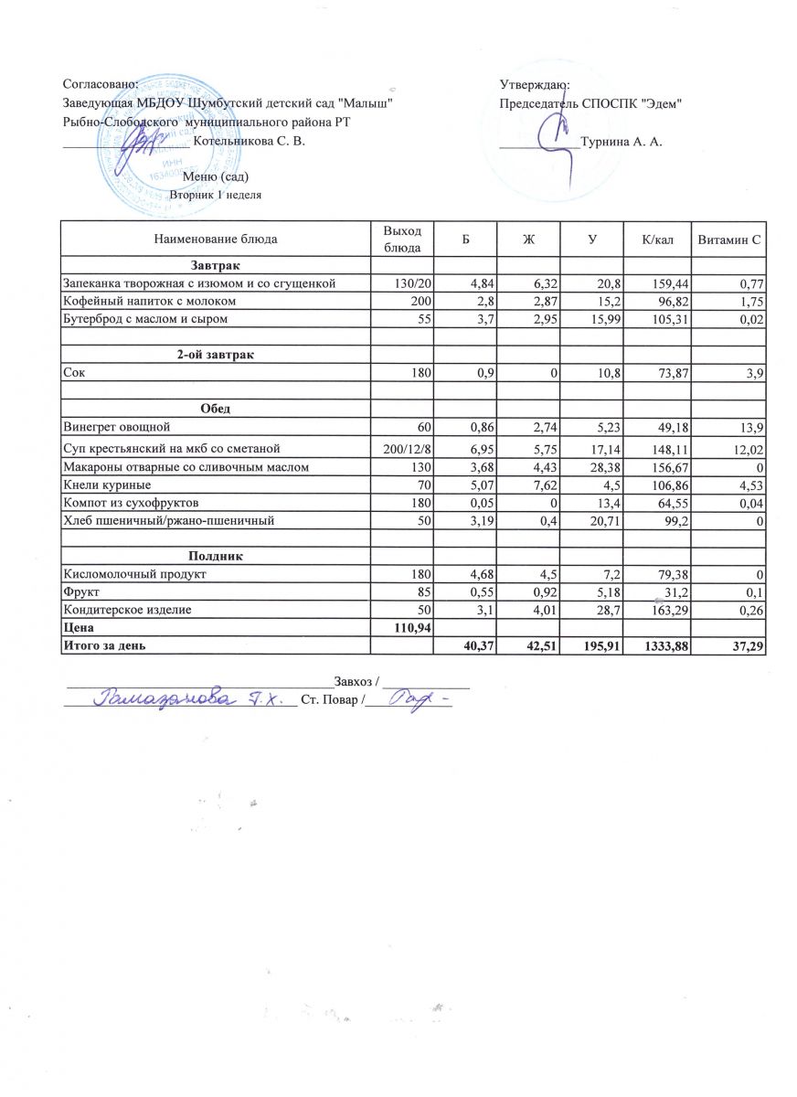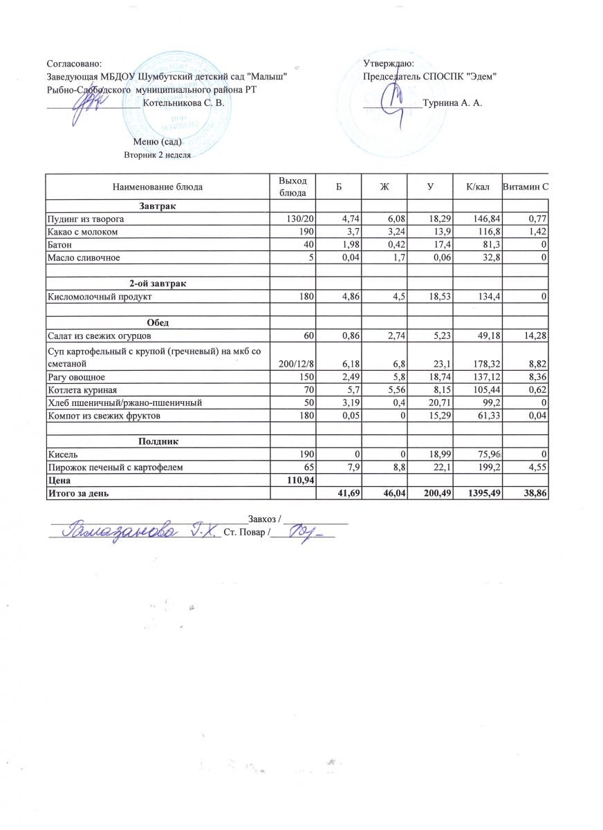 Меню на 12.04.2022г. Вторник 2 неделя