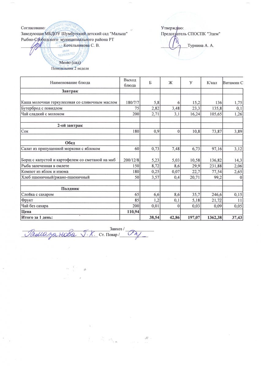 Меню на 11.04.2022г. Понедельник 2 неделя