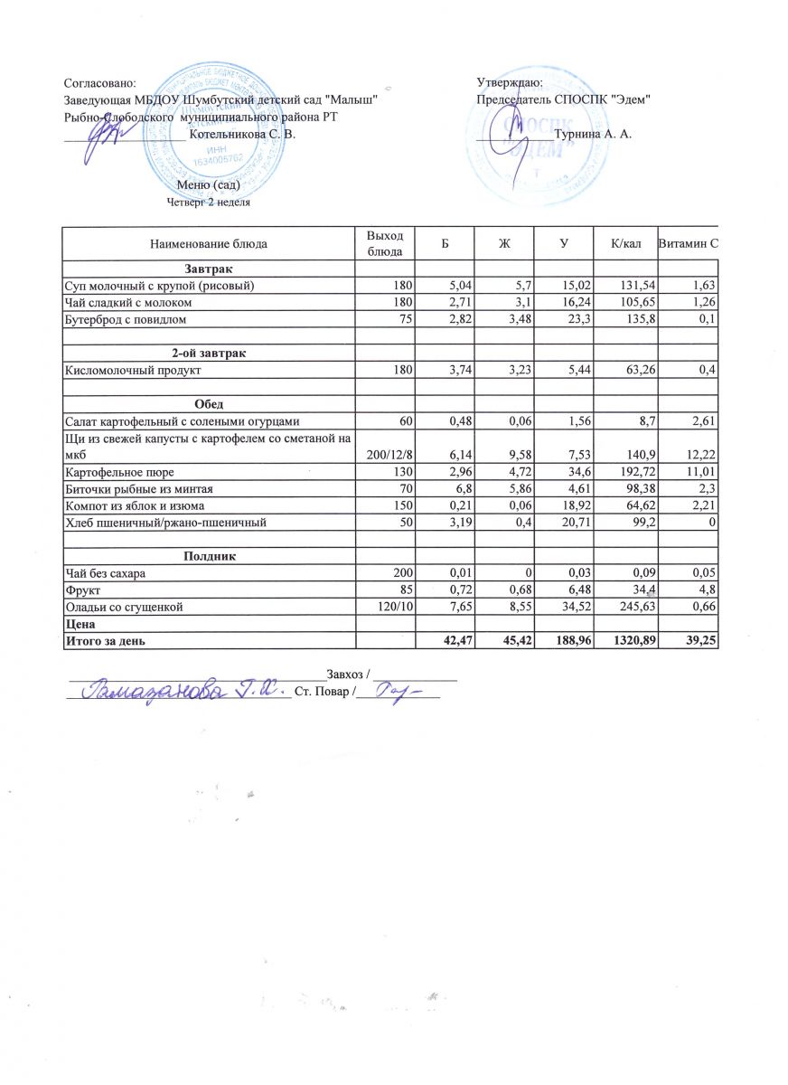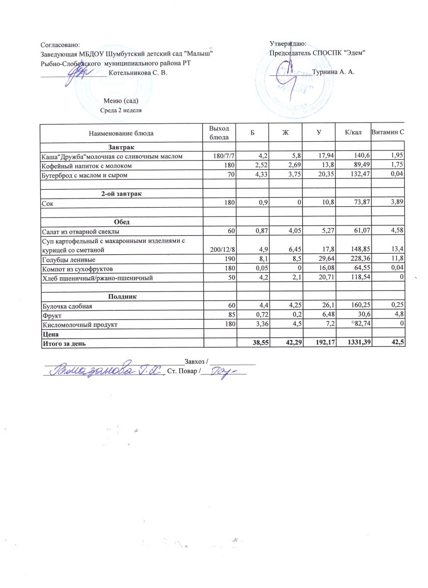 Меню на 13.04.2022г. Среда 2 неделя