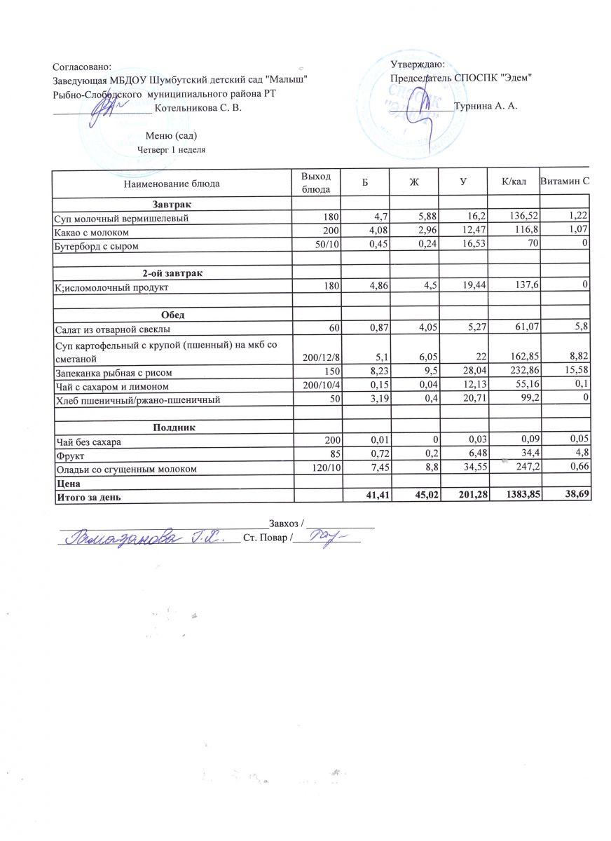 Меню на 21.04.2022г. Четверг 1 неделя