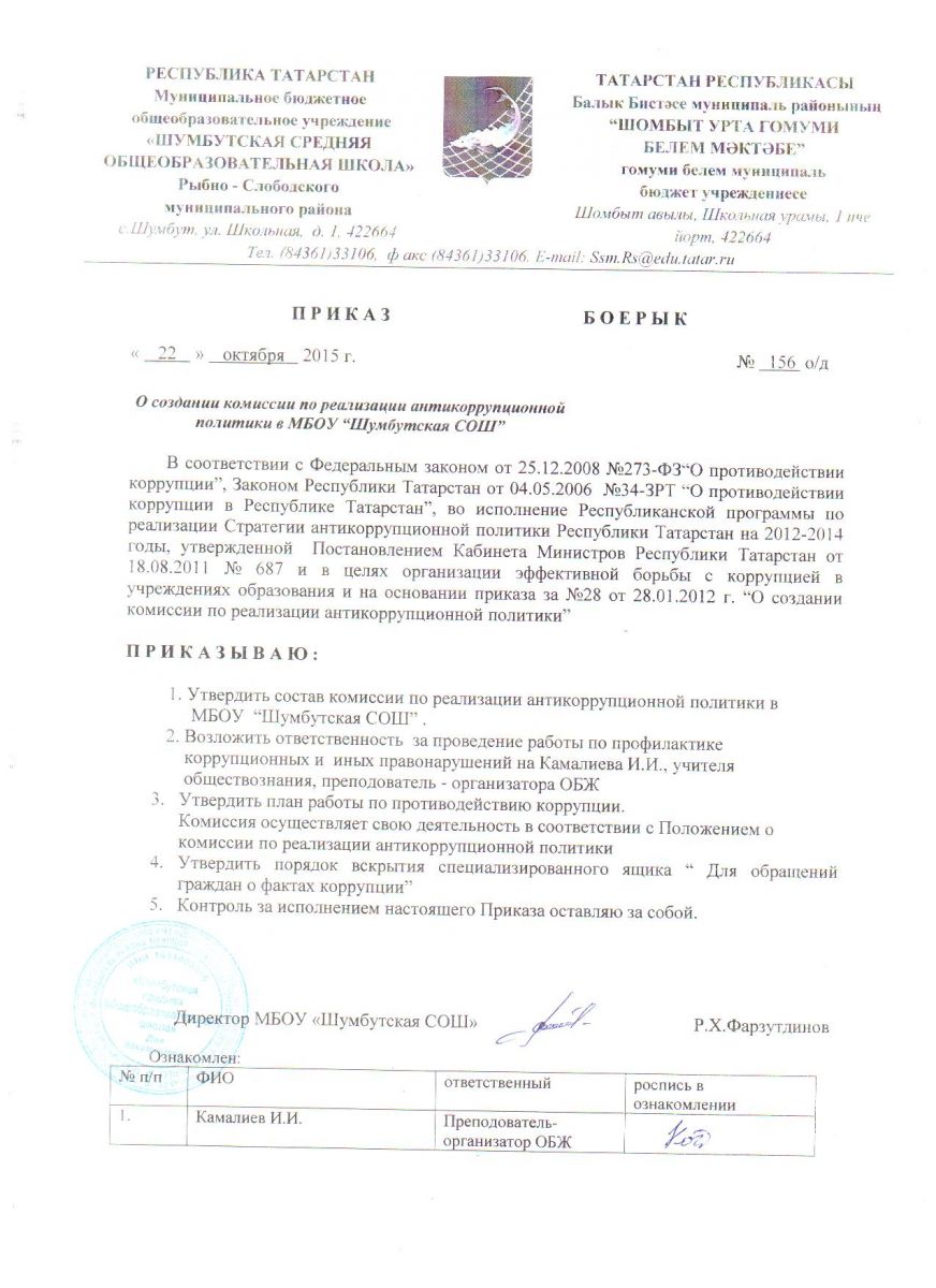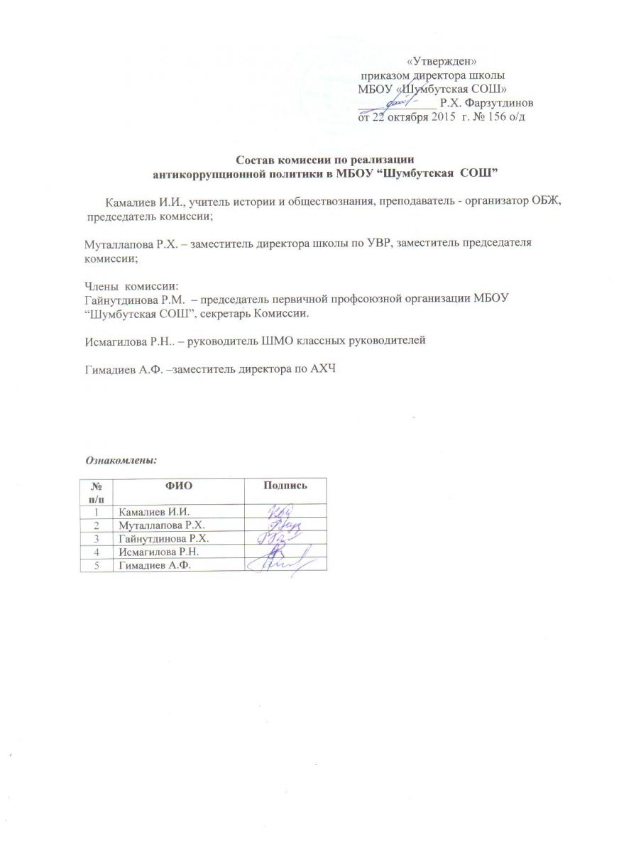 ПРИКАЗ о создании комиссии по реализации антикоррупционной политики в МБОУ "Шумбутская СОШ"