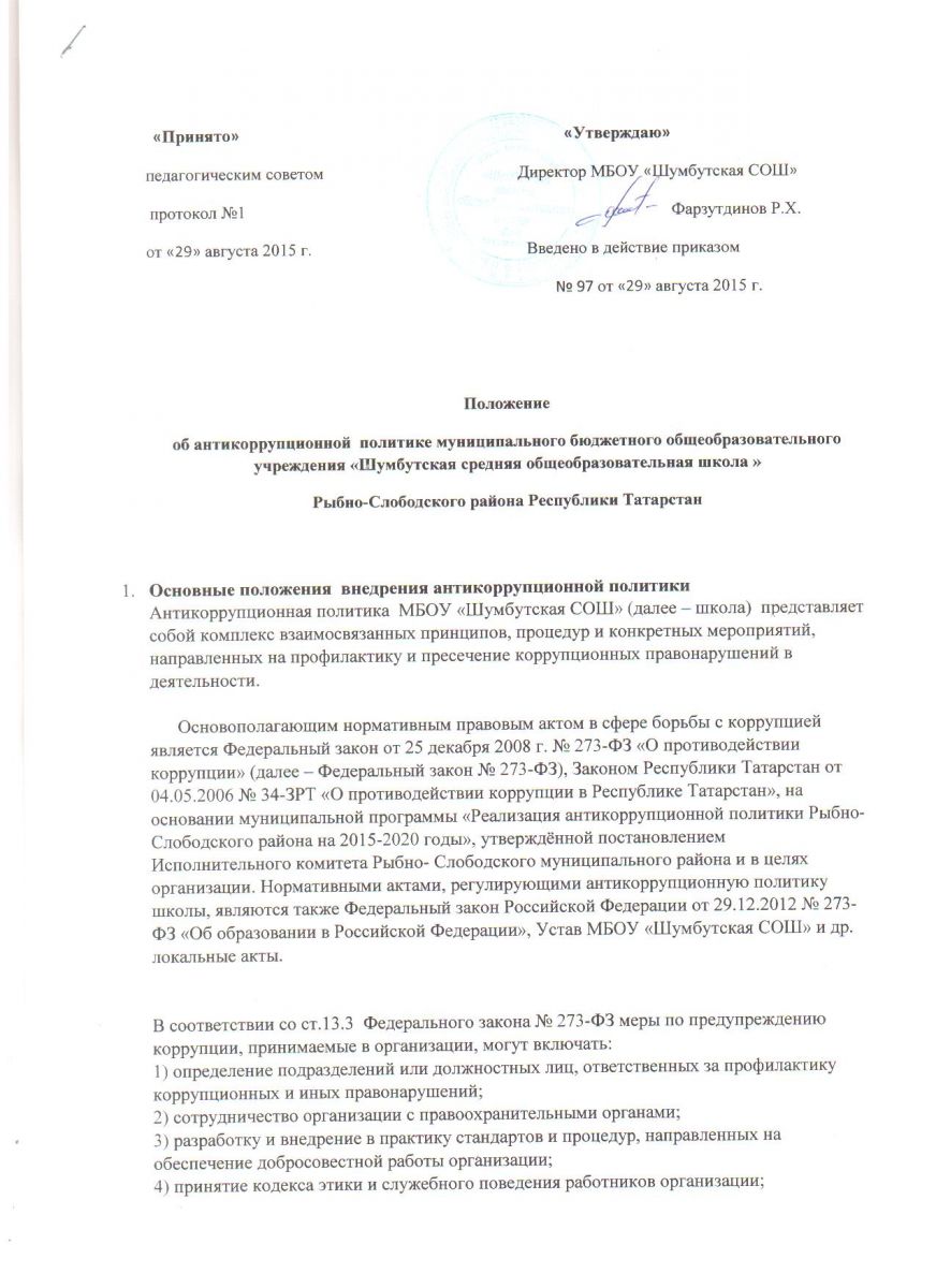 Положение о антикоррупционной политике в МБОУ "Шумбутская СОШ"