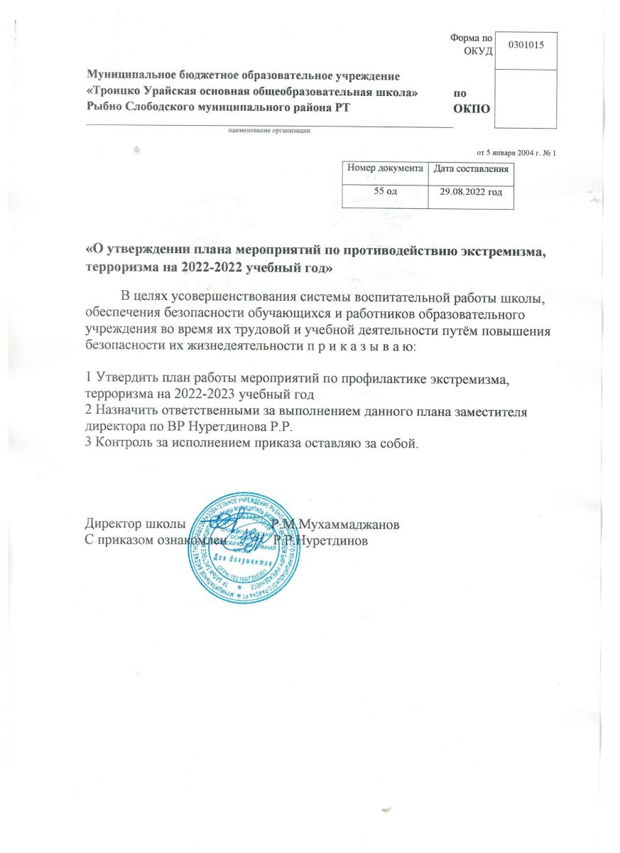 Приказ об утверждению плана по профилактике экстремизма, терроризма на 2022-2023 учебный год
