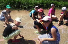 Асфальтта рәсем ясауның тематикасын "Мин дөньяны үземчә аңлыйм..." дип атадык. Рәсем өчен балалар урын сайладылар, чистарттылар, эскизын сыздылар. Һәрбер отряд членына эш бүлеп бирелде. Төсле акбурлар белән эшләү бик отышлы булды, чөнки иҗат эшенең эффектлылыгын арттырды.