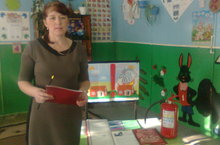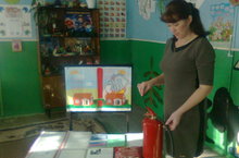 Балалар бакчасы мөдире Вәлиева Ләйсән Вакыйф кызының бакча хезмәткәрләренә инструктаж үткәргәндә огнетушительне дөрес итеп кулланырга өйрәткән вакыты