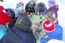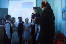 Эшчәнлек барышында балалар аюга бал мичкәсен ачарга булышалар