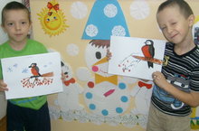 Балалар белән кисеп ябыштыру эшчәнлегендә кыш, кышлаучы кошлар, аларның кышны ничек каршылаулары хакында сөйләштек һәм үзләренең фантазияләрен файдаланып кызыл түшне кисеп ябыштырдык.
