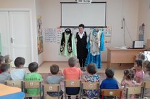Бүген безнең бакчабызга китапһанәче Люция Борисовна килде. Ул балаларны татар халык милли киемнәре белән таныштырды.