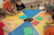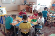 Кисеп ябыштыру эшчәнлегендә кул учлары ярдәмендә күбәләкләр кисеп ябыштырдык.