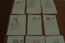Бүгенге эшчәнлектә Золушка алып килгән күлмәкләрнең якаларын һәм җиңнәрен рус телендә әйтергә өйрәндек, бирелгән төсләр ярдәмендә буядык.