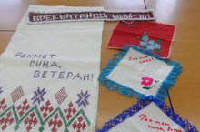 Кул эшләре арасында бисердән эшләнгән тасма, "Рәхмәт сиңа, ветеран!" дип исемләнгән чиккән сөлге, кулъяулыклар һ.б. бар иде. 6 сыйныф укучысы Ахунзянова Аниянең, 5 сыйныф укучылары Гыйлметдинова Әдилә, Ногманова Диләрә, Галимова Нәзирә, Хабибрахманова Алсуның ветеранга бүләге һәм 5 сыйныфларның күмәк хезмәт җимеше барыбызга да ошады. Иң яхшы дип табылган эшләр конкурсның район турына тәкъдим ителде.