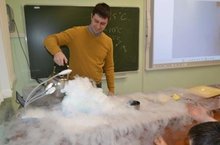 Сегодня, 11 декабря, в рамках недели «Опыты и эксперименты», учитель физики кафедры общей физики КФУ - Ирисов Денис Сергеевич провел научное шоу с жидким азотом. Жидкий азот- необыкновенно холодное вещество. Замороженные фрукты, ледяные воздушные шарики, морозный дым, эффектные взрывы - всё это не оставил равнодушным ни одного ребёнка.
