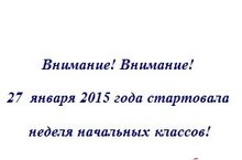 Предметная неделя в начальных классах является частью учебно-воспитательного процесса. Она проводится для того, чтобы повышать общую осведомлённость и образованность детей, влиять на их познавательную активность, углублять знания по предметам. Вот и сейчас целая серия мероприятий была втиснута в рамки недели начальных классов с 27января по 3 февраля 2015 года. В первый день – 27.01.15 - состоялось открытие Недели, на которой был дан старт всем мероприятиям.