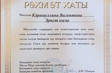 Татар халкының телен, мәдәниятен үстерүдә, гореф-гадәтләрен саклап калуда башкарган зур эшләре өчен мәктәбебез директоры Кәримуллина Валентина Эрнст кызы Бөтендөнья татар конгрессының рәхмәт хаты белән бүләкләнде. Чын күңелдән котлыйбыз, алга таба да уңышлар телибез.