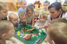 "Йорт хайваннары һәм кошлары" атналыгы барышында беренче кечкенәләр төркемендә балалар Рәхилә Расиховна белән берлектә йорт кошлары һәм хайваннары белән танышуны дәвам иттеләр. Ишек алды макеты, рәсемнәр ярдәмендә аларның төс, кыяфәте күзәттеләр, тавышларыннан аера белергә, шигырьләр өйрәнделәр, әкиятләр тыңладылар.