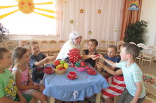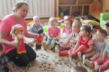 "Әбиемнең сандыгы" 04.07.2016 Бүген, икенче иң кечкенәләр төркеменең музыка шөгылендә Нурания Әюповна "Әбиемнең сандыгы" темасына карата үзенчәлекле эшчәнлек үткәрде. Төркемгә кунакка курчаклар һәм шалтравыклар да килгән иде. Балалар алар белән М.Бикбованың "Шалтыравык" җырына биеделәр. Эшчәнлекнең максаты да нәкъ шуларга юнәлдерелде: балаларда күңелле көйгә карата шатлык хисе турыду, җыр эчтәлеге буенча хәрәкәтләр ясап,образга кереп, гади бию хәрәкәтләрен башкарыру.