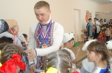 Рушан Миңнегулов безнең "Шатлык" балалар бакчасында тәрбияләнеп үскән егет. Шуңа күрә дә, без кичекмәстән аны үзебезнең янга чакырып балалар белән очрашу оештырдык.
