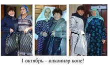 1 октябрь - Өлкәннәр көне 03.10.2022 1 октябрь - Өлкәннәр көне уңаеннан бакчабызда озак еллар эшләп бүгенге көндә лаеклы ялда булган хезмәттәшләребезне котлап пакетлар тараттык. Хезмәттәшләребез сөенеп каршы алдылар, хөрмәтләгәнгә рәхмәтләрен җиткереп, уңышлы эш көннәре теләп калдылар.