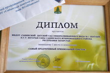 Яз көне утырткан яшелчәләребез көзен мул уңыш бирде. Балаларны тукландыруда, витаминлы ризыклар әзерләүдә бакчабызның яшелчә бакчасында үстерелгән кызыл чөгендер, кишер, бәрәңге кулланыла. Быел яшелчәләрнең уңышы бай,күп булды. Район күләм балалар бакчалары арасында үткәрелгән бәйгедә безнең балалар бакчасы "Иң уңдырышлы бакча" исеменә лаек булды һәм Диплом белән бүләкләнде.