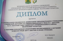 Балаларны мәктәпкә әзерләүдә "Шатлык" балалар бакчасы коллективы район күләм үткәрелгән өйрәнүләрдә беренче урынны яулады. Август конференциясе кысаларында коллективка Саба муниципаль районы Башкарма комитеты мәгәриф бүлеге җитәкчесе Шакиров И.Ф. Диплом тапшырды. Чын күңелдән зур нәтиҗәгә ирешүләре белән котлыйбыз, киләчәктә уңышлар теләп калабыз.